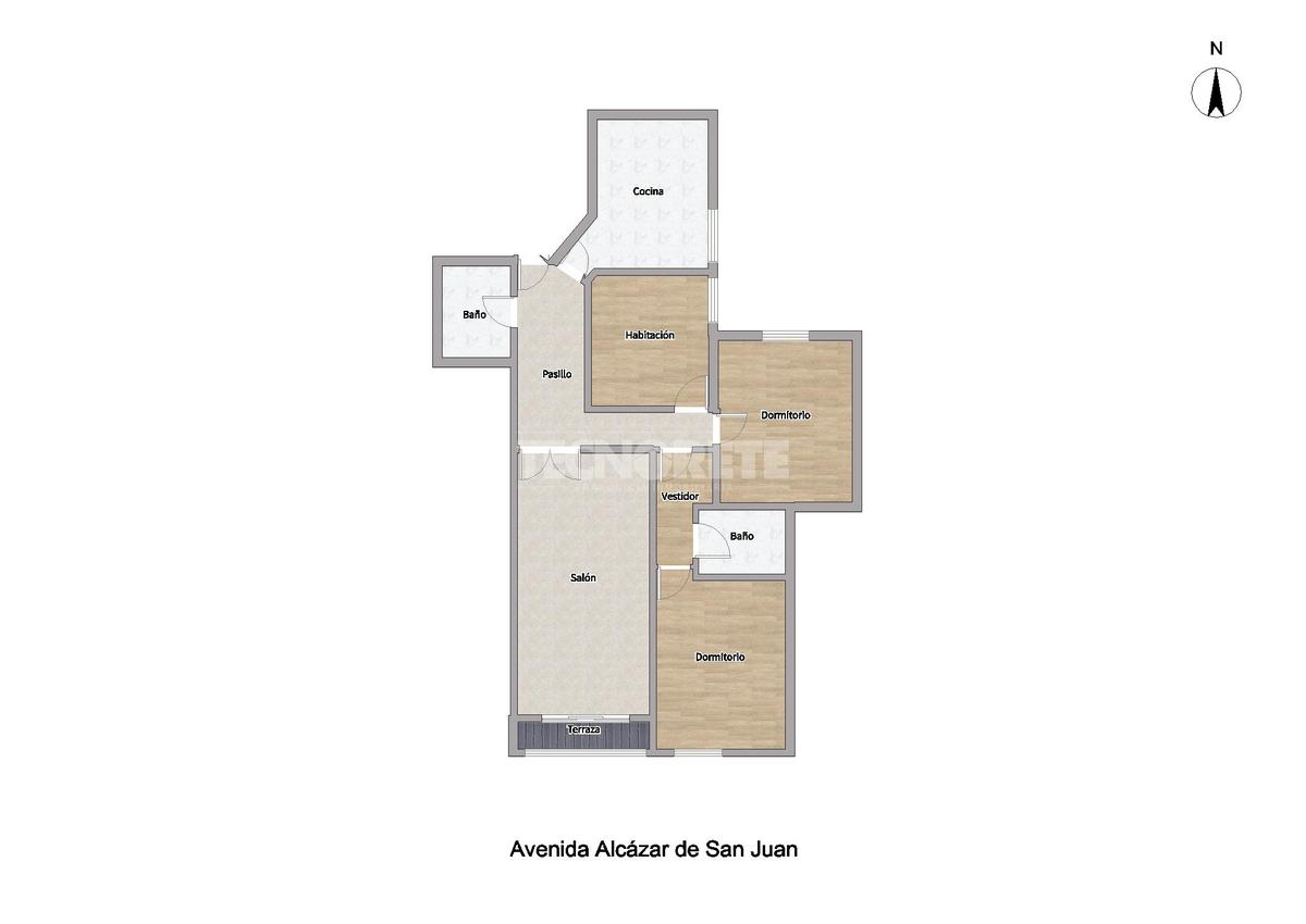 Se distribuye con una entrada/hall, cocina independiente amueblada, salón/comedor muy luminoso ya que tiene acceso a una terraza exterior, tres dormitorios dobles (uno de ellos con baño en suit y plato de ducha) y un baño completo con bañera.