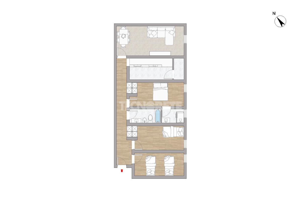 La vivienda está distribuida al entrar un hall que nos da paso a un pasillo con dos armarios empotrados y acceso a todas las dependencias, 2 habitaciones dobles (una de ellas con armario empotrado), baño completo con bañera, habitación principal con armario empotrado y baño en suite con plato de ducha.